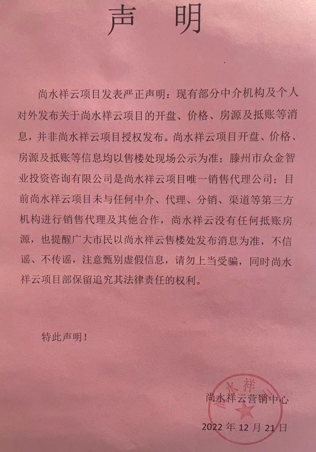 尚水祥云項(xiàng)目發(fā)表嚴(yán)正聲明:現(xiàn)有部分中介機(jī)構(gòu)及個(gè)人對(duì)外發(fā)布關(guān)于尚水祥云項(xiàng)目的開盤、價(jià)格、房源及抵賬等消息,并非尚水祥云項(xiàng)目授權(quán)發(fā)布。