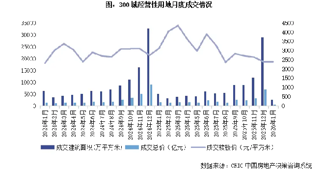 根據(jù)克而瑞研究中心發(fā)布的報告,截至2026年1月25日,土地供應建筑面積為3360萬平方米,環(huán)比下降50%,同比下降8%。本月監(jiān)測城市平均供地容積率為1.96,優(yōu)質(zhì)低密宅地成為供應主力。